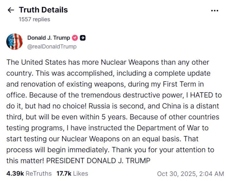 "Debido a los programas de pruebas de otros países, he dado instrucciones al Departamento de Guerra para que comience a probar nuestras armas nucleares en igualdad de condiciones. Ese proceso comenzará de inmediato", dijo Trump a través de su red social Truth Social.