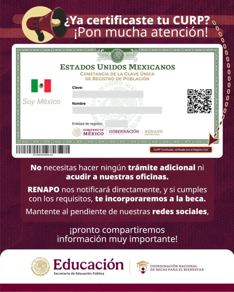 Esto significa que, si ya certificaste tu CURP, solo queda esperar la confirmación oficial y estar pendiente de las plataformas digitales del programa para conocer los siguientes pasos.