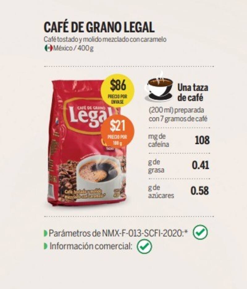 Teniendo todos estos parámetros en consideración, el café Legal sobresalió al ofrecer una taza de 200 ml con 108 a 114 mg de cafeína, 0.41 a 0.48 g de grasa y precios que van desde los $21 hasta los $31 por cada 100 g, muy por debajo de otras marcas del mismo segmento.