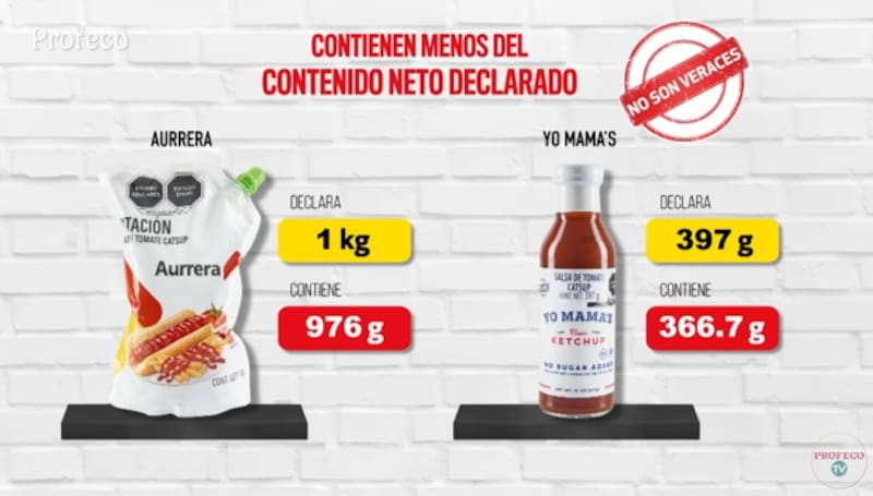 Se encontró que dos marcas concretas, Aurrera y Yo Mama's, presentaron un poco menos que la cantidad que declaraban en su etiqueta. Para el primer caso, el producto aseguraba ofrecer 1 kg de salsa aunque contenía 976 g. En la segunda marca, la irregularidad se registró por 30 gramos de diferencia entre lo que declaraba y lo que contenía, lo cual ubica a estos productos como "no veraces".