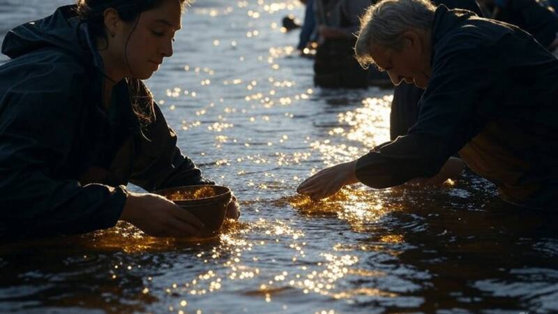 A lo largo de los siglos, la erosión ha liberado pequeñas pepitas que quedan atrapadas entre la arena y las piedras, listas para ser descubiertas por quienes saben dónde buscar.