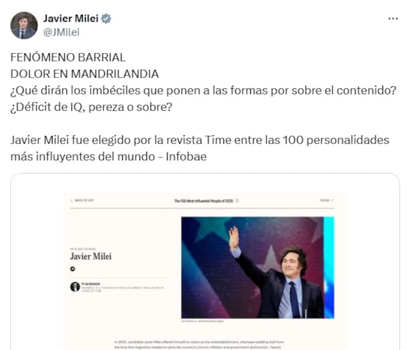 Ante la noticia, el mandatario argentino, se manifestó en su perfil oficial de X con gran exclamación: "Fenómeno barrial dolor en mandrilandia ¿Qué dirán los imbéciles que ponen a las formas por sobre el contenido? ¿Déficit de IQ, pereza o sobre?", fue su mensaje en la red social.