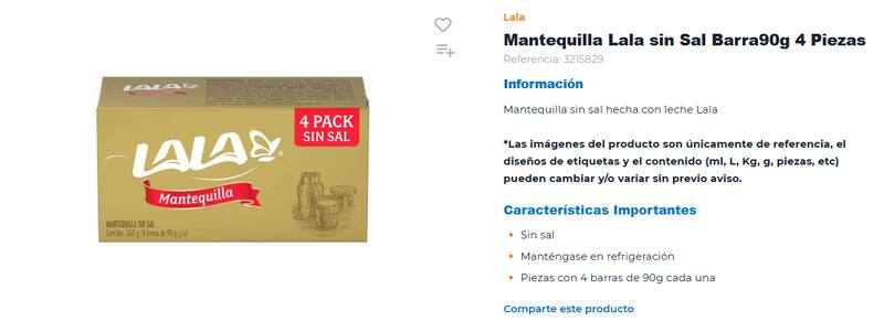 La mantequilla sin sal recomendada por Profecoes la de la marca Lala, en presentación de 90 gramos.