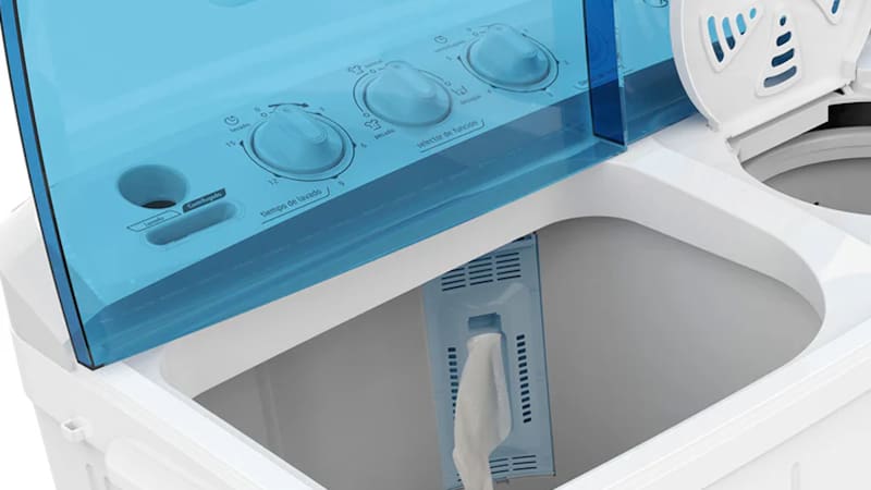 La lavadora Midea destaca por su diseño de doble tina semiautomática y un potente mecanismo conocido como Sistema Twin Force. Esta tecnología es clave para el ahorro de tiempo y esfuerzo: