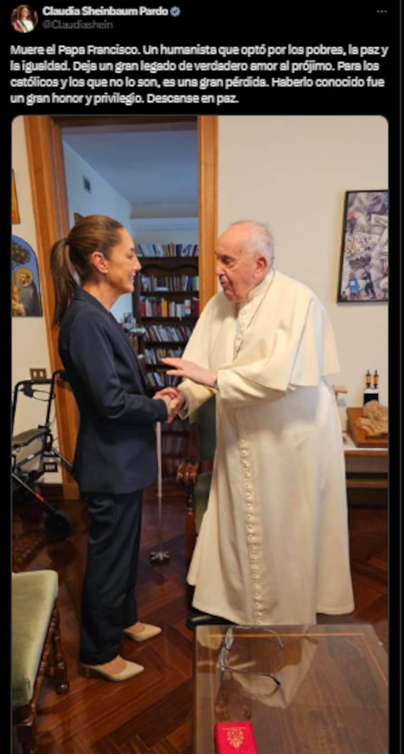 Desde México, la presidente Claudia Sheinbaum se unió a las voces que despidieron al Papa Francisco con un emotivo mensaje en redes sociales.