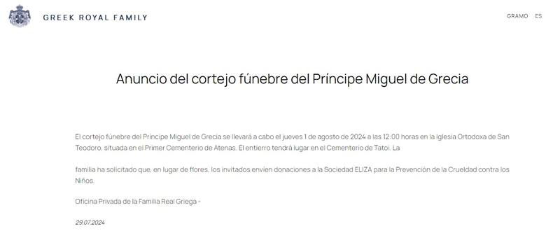 La Familia Real de Grecia emitió un comunicado oficial donde anunció el fecha, el lugar y la hora donde será el cortejo fúnebre del príncipe Miguel de Grecia.