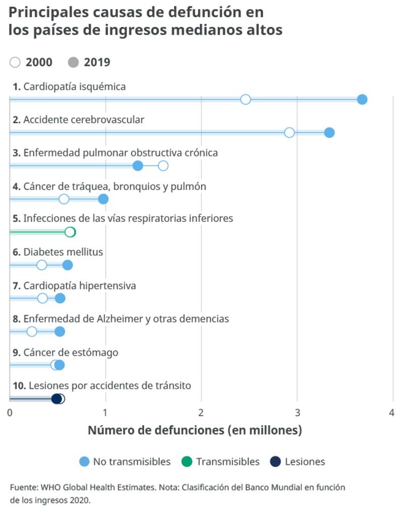 Según un informe del Banco Mundial, para el 2020, México hacía parte de las economías mundiales con ingresos medianos altos per cápita con montos entre 4.466 a 13.845 dólares. En esa línea, hicimos un match con las principales causas de muerte publicados por la OMS en países con ingresos medianos altos.