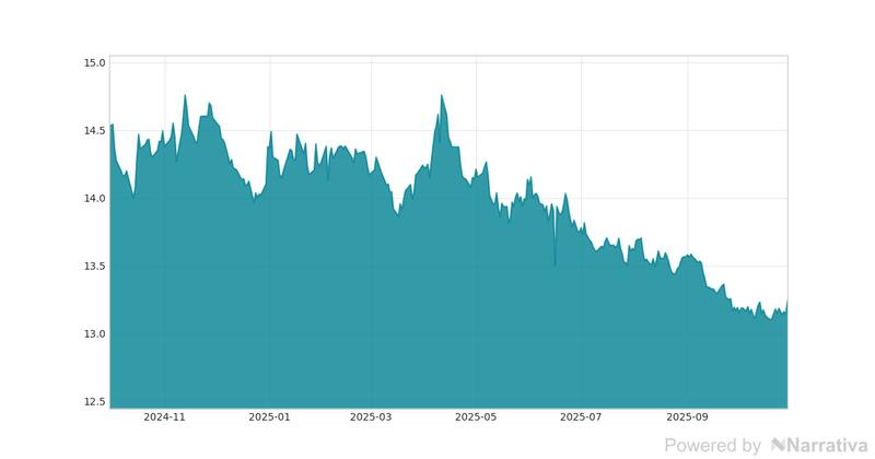 Durante el día de ayer, este activo presentó un costo máximo de 13.26 pesos y un mínimo de 13.21 pesos.