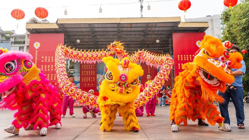 Este enorme dragón se caracteriza por sus movimientos ondulantes, realizados por un grupo sincronizado de bailarines, que imitan la fluidez del agua, un elemento vital asociado con la abundancia.