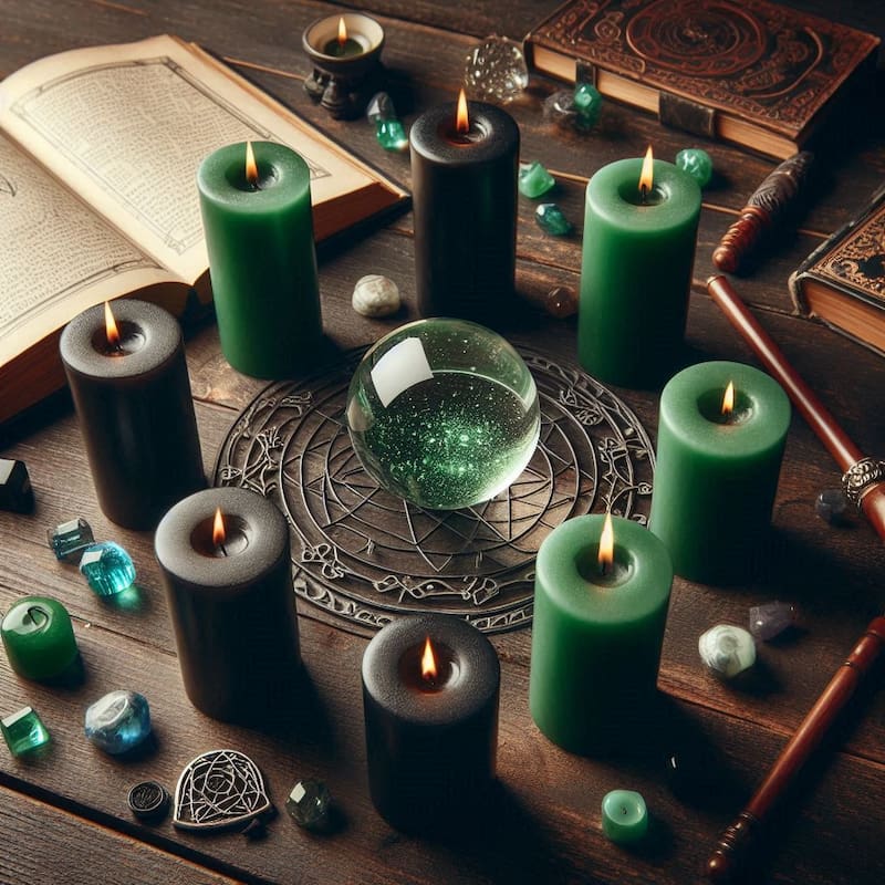 Las velas verdes y negras se complementan en rituales de protección. La vela negra absorbe y neutraliza energías negativas, creando un escudo contra las influencias dañinas.
