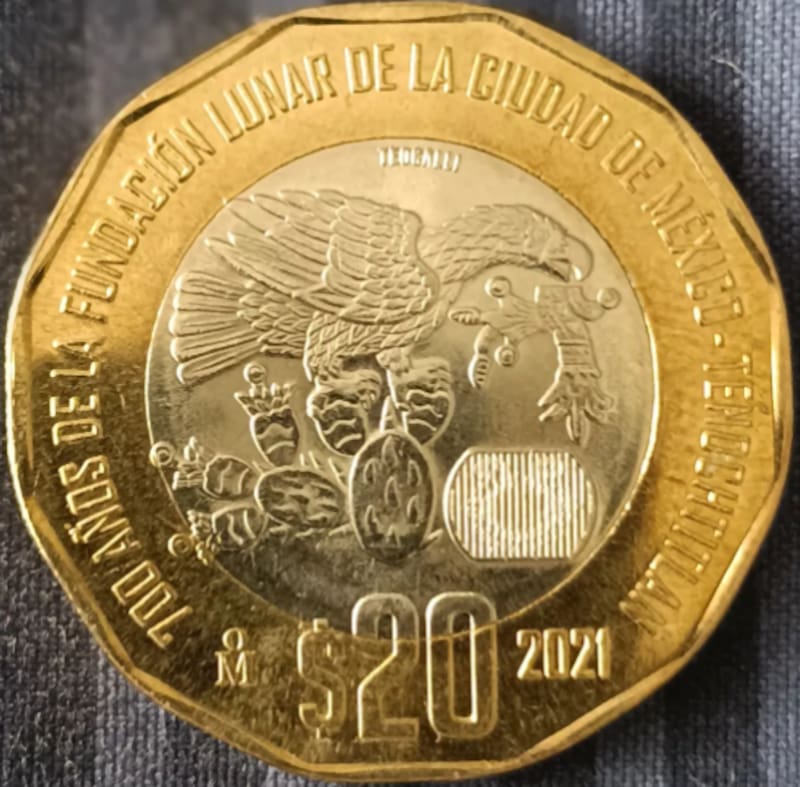 La moneda de 20 pesos con el águila sagrada, emitida por Banxico, es una pieza conmemorativa única en honor a los 700 años de la fundación lunar de la Ciudad de México-Tenochtitlan.