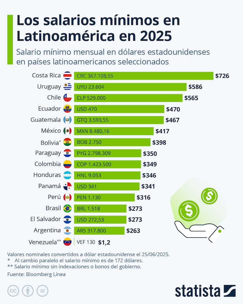 Según la infografía de Statista, el país con el salario mínimo más alto es Costa Rica, que en este segundo semestre asciende a aproximadamente $726 USD al mes. Le sigue Uruguay en el segundo lugar, garantizando a sus trabajadores un ingreso mensual mínimo de $586 USD.