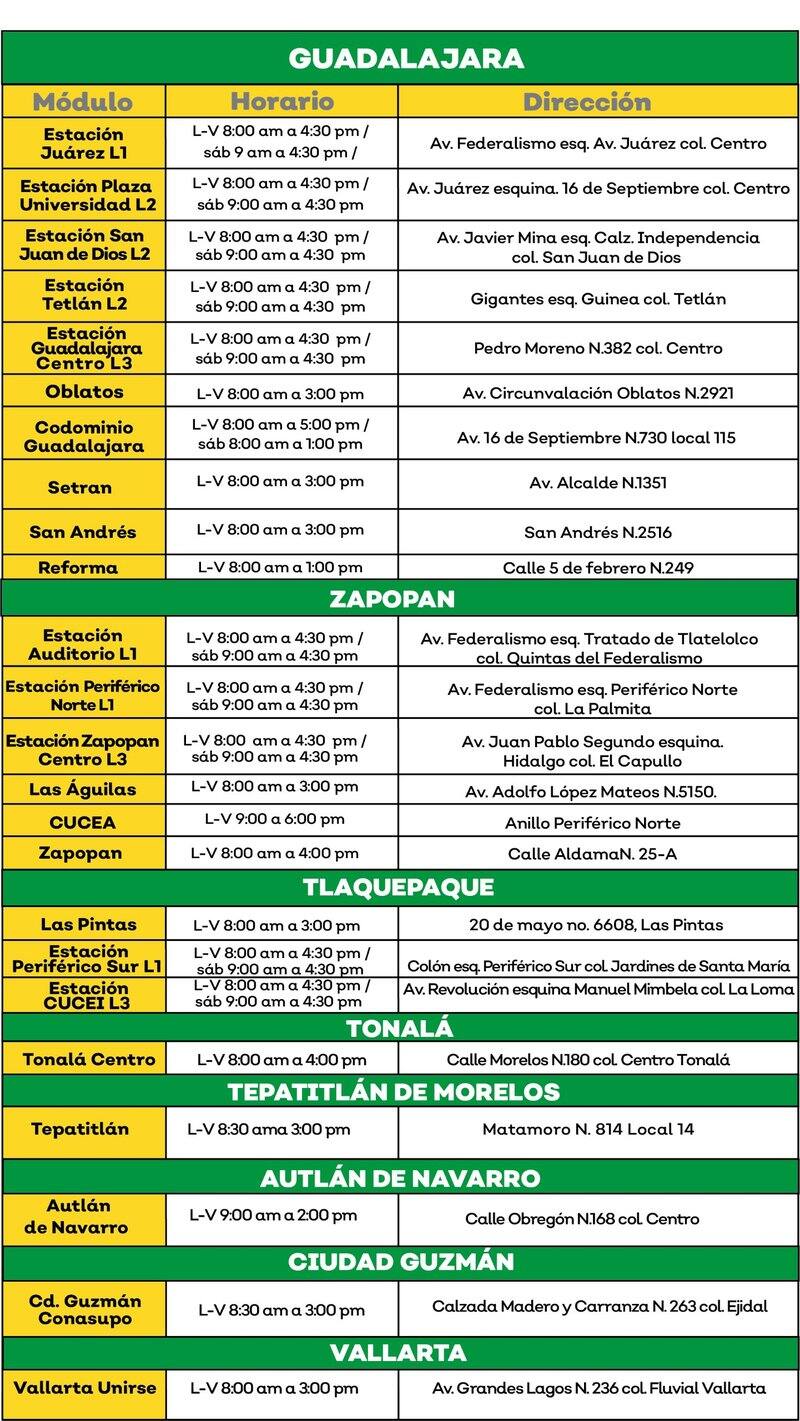 El trámite puede realizarse en uno de los 20 módulos del Área Metropolitana de Guadalajara, así como en los que se encuentran en Tepatitlán, Autlán, Ciudad Guzmán y Puerto Vallarta.