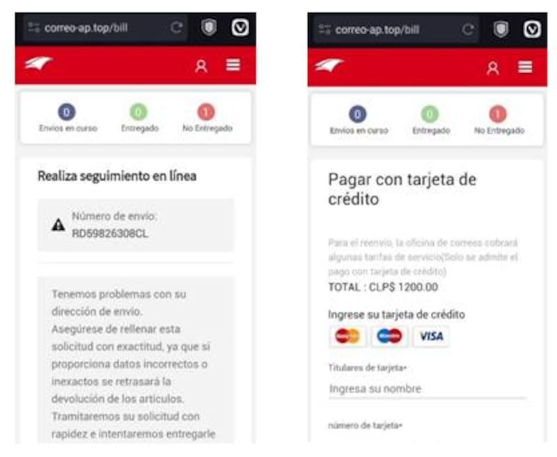 El mensaje de texto contiene un enlace que parece dirigir a una página legítima de una entidad reconocida de envíos. Sin embargo, esta página es en realidad una imitación fraudulenta y en ella se solicita a las víctimas que realicen un pago para recibir el paquete.