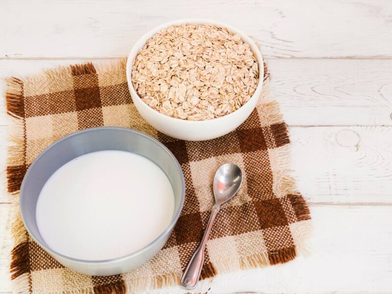 Coloca la leche y la avena en una licuadora. Es fundamental mezclar bien estos dos ingredientes para que la avena se ablande un poco, lo que ayudará a conseguir una textura más suave.