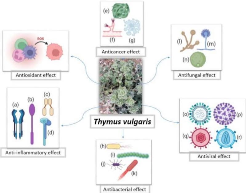 El componente principal del tomillo, el timol, tiene propiedades antioxidantes, antiinflamatorias y antimicrobianas, lo que lo hace útil en la conservación de alimentos y como condimento. El tomillo también es rico en fenoles monoterpenoides y carvacrol.