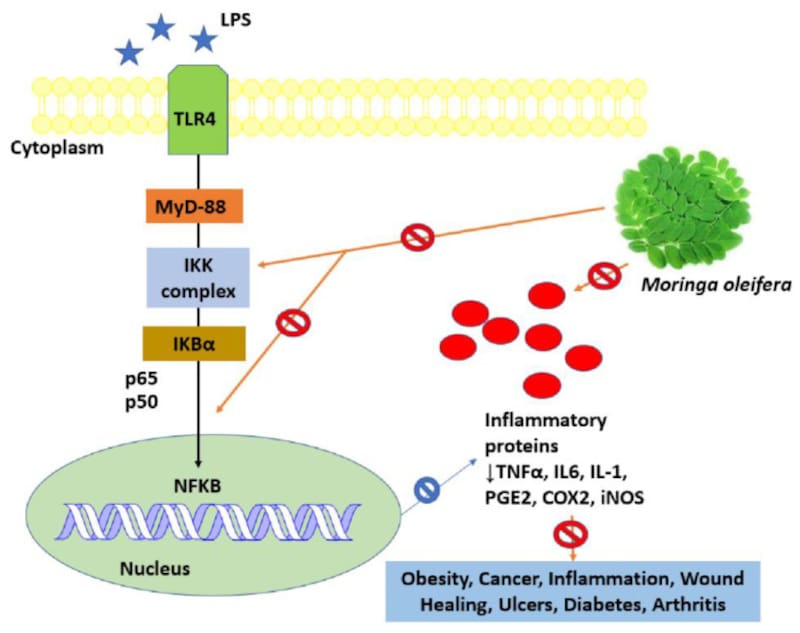 Los NIH, en una de sus comunicaciones científicas publicada originalmente en inglés con el nombre de "Moringa oleifera: An Updated Comprehensive Review of Its Pharmacological Activities, Ethnomedicinal, Phytopharmaceutical Formulation, Clinical, Phytochemical, and Toxicological Aspects", demostraron cómo actúa la moringa como agente anticancerígeno.