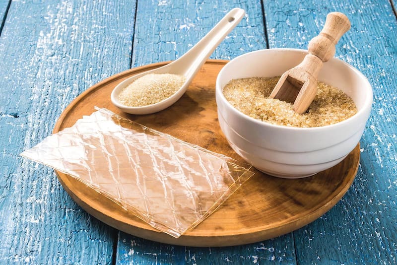 El tercer paso implica la hidratación y disolución de la grenetina. Se incorpora este ingrediente a una parte del líquido de hierbabuena, calentando suavemente sin llegar al punto de ebullición. Una vez disuelta por completo, se añade el endulzante elegido al gusto.