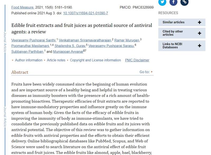 "Se informa que la eficacia terapéutica de los extractos de frutas tiene propiedades inmunomoduladoras e influye en gran medida en el sistema inmunológico del cuerpo humano", agrega National Institute of Health en estudio científico publicado el 2021, "Extractos y jugos de frutas comestibles como fuente potencial de agentes antivirales: una revisión".