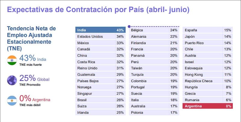 Al compararlo con los demás países de la región, la diferencia es aún más evidente. Por ejemplo, países como México presentan 33 puntos; Brasil, 26; Perú, 20; Colombia, 19; y Chile, 13. Mientras tanto, Argentina se mantiene en cero. Esto significa que, en Argentina, la cantidad de empleadores que planean incorporar personal es igual a la cantidad de empleadores que reducirán su dotación.