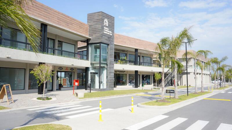 El complejo comercial está compuesto por cinco bloques distribuidos en dos plantas, conectados a través de una pasarela peatonal semicubierta que permite el acceso a ambos niveles sin perder la conexión con la naturaleza circundante.