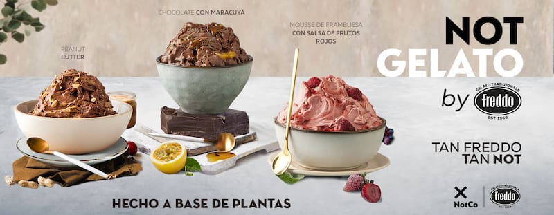 En asociación con NotCo, la start-up chilena de alimentación basada en plantas, la tradicional heladería acaba de lanzar NotGelato, su primera línea plant-based, que incluye tres sabores:peanut butter, chocolatecon maracuyá y mousse de frambuesas con salsa de frutos rojos.