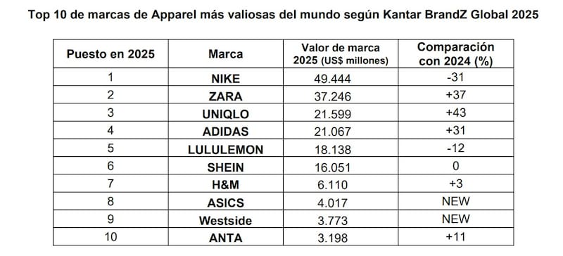La ranking elaborado por Kantar, como parte del BrandZ Global de las Marcas más Valiosas de este año, muestra que Nike continúa en el primer puesto del segmento con un valor de marca de u$s 49.444 millones pero mostró una fuerte caída en la valoración con respecto a 2024, de 31%.