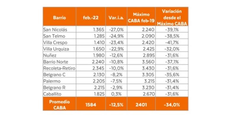 Ya completando el top tres está San Telmo, que desaceleró un 38,5% los valores desde el 2019. El precio del m2 actual es de u$s 1285, cuando hace dos años era de u$s 2090.