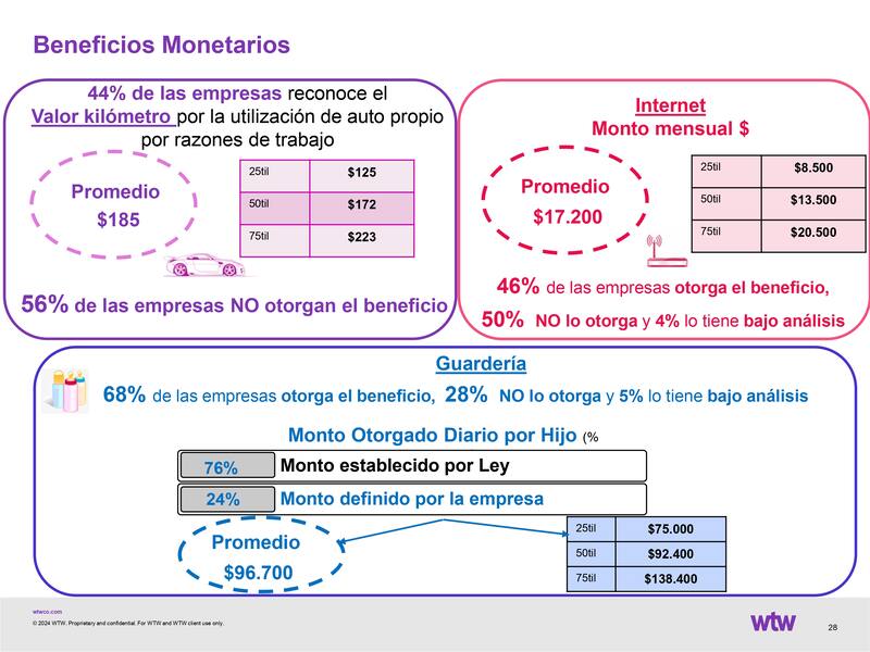 - Guardería: un 68% de las organizaciones da el beneficio de guardería y un 5% lo tiene bajo análisis; con una monto promedio de $ 96.700.