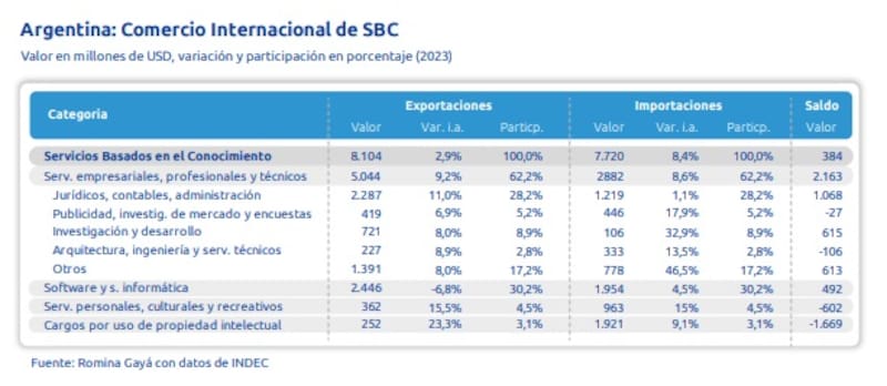 En términos de exportaciones, la contrapartida fue la disminución del nivel de los servicios informáticos, con una caída del 6,8%. No obstante, aclara el informe que, el valor exportado de este rubro no estuvo acompañado por una reducción del empleo ocupado, que se mantuvo con un crecimiento interanual en 2023 del 4,7 por ciento.