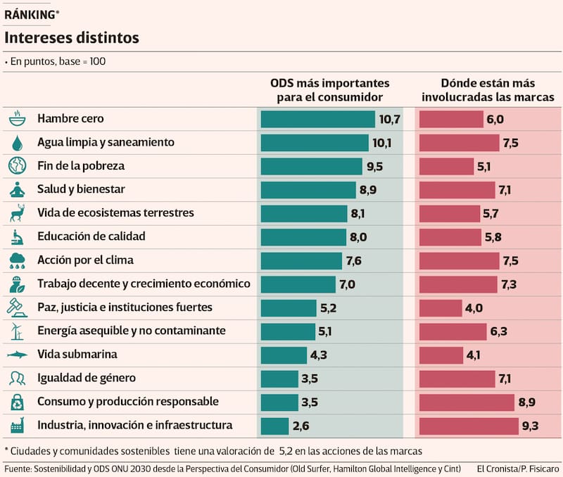 Y así sigue la lista de desencuentros. Mientras Consumo y producción sustentable ocupa el segundo lugar de lado del interés de las marcas, siempre según el consumidor, para él la relevancia no pasa del puesto 13.