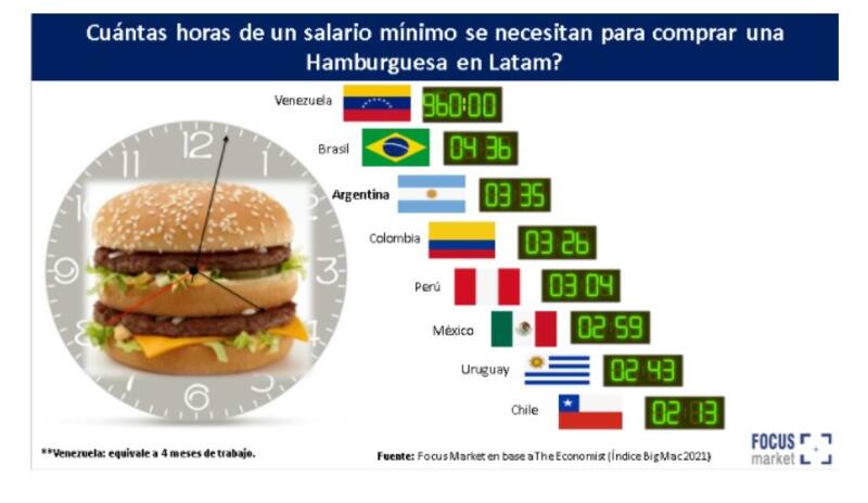 Para el caso de la compra de una hamburguesa en Venezuela se requieren 960 horas de trabajo medidos en su salario mínimo vital y móvil, en Uruguay se requieren 2 horas y 43 minutos y en Chile 2 con13 minutos.