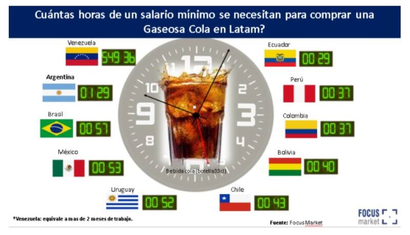 Para el caso de la compra de una Gaseosa Cola en Venezuela se requieren 549 horas y media, en Argentina 1 hora con 29 minutos, mientras en el otro extremo en Perú se requiere 37 minutos y en Ecuador 29 minutos.