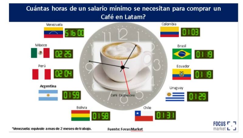 Para el caso de la compra de un Café en Venezuela se requieren 516 horas, en México 2,25, en Perú 2,4 mientras en el otro extremo en Brasil se requieren 1,19 y en Colombia 1,3 minutos ambos países con producción local de café.