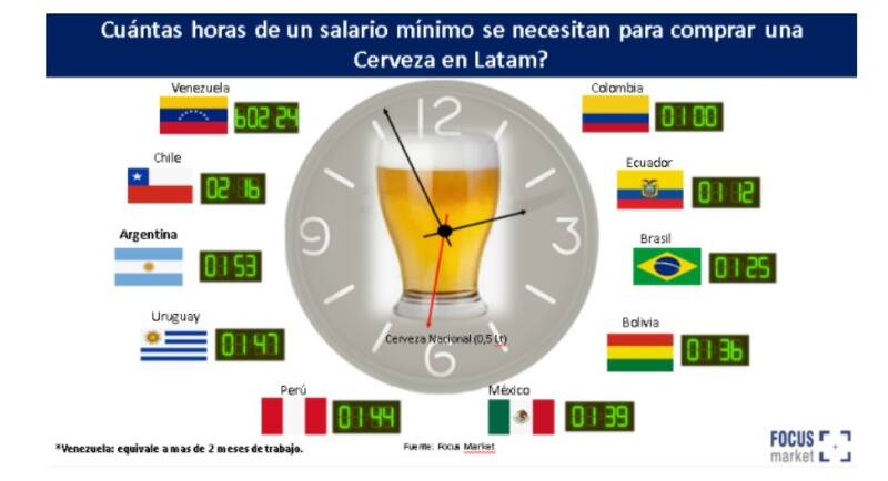Para el caso de la compra de una Cerveza en Venezuela se requieren 602 horas con 24 minutos, en Chile 2 horas y 16 minutos, en Argentina 1 hora con 53 minutos mientras en el otro extremo en Ecuador se requieren 1 hora con 12 minutos y en Colombia 1 hora.