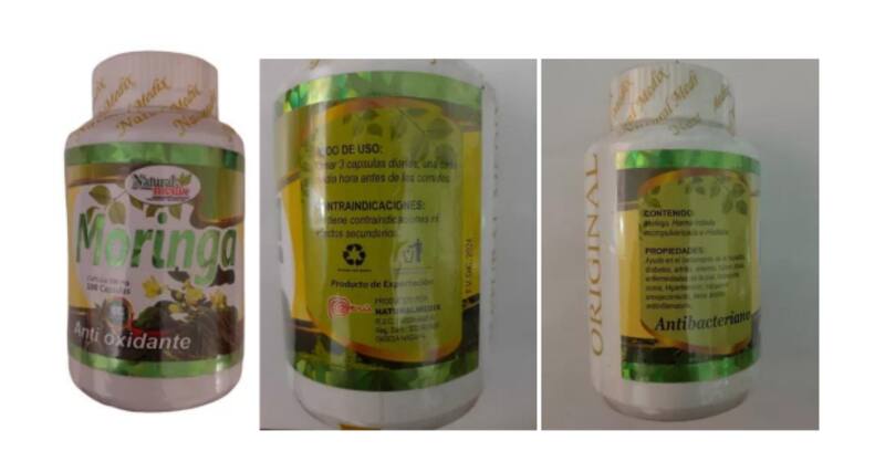 - "Moringa, Antioxidante, Antibacteriano, cápsula 500 mg, 100 cápsulas, producido por NATURALMEDIX, R.U.C.: 10125668819, Reg. Sant.: S3356656N, DIGESA NASAPA".
