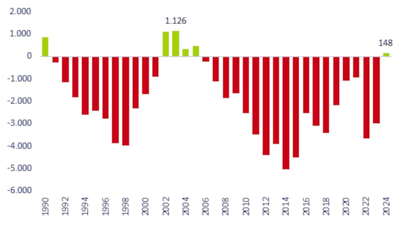 El saldo comercial es históricamente deficitario, con solo cinco períodos de superávit entre 1990 y 2023, donde el promedio reciente (últimos diez años) marca un déficit promedio de casi u$s 3.000 M. En cambio, en 2024, el valor acumulado de once meses marca un superávit de u$s 148 M, luego de 18 años de déficit, con un crecimiento del 16% de las exportaciones y una contracción de 30% de las importaciones, motivado por la corrección de precios relativos y recesión local.
