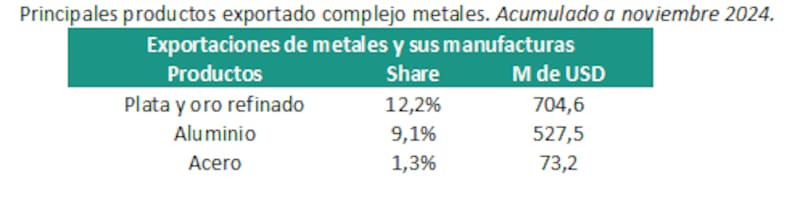 Argentina exporta una cantidad considerable de metales como plata, oro, aluminio y acero. Este sector representa el 22,6% de las exportaciones totales, con un valor de u$s1.305,3 M. La plata y oro refinado representan el 12,2% de las exportaciones totales, y es particularmente demandado por la industria tecnológica y joyera en Estados Unidos. En tanto, el aluminio se destina a la industria automotriz y aeroespacial.