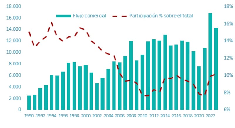 En 2023, último año cerrado, el intercambio fue de u$s 15.157 M (10,1% del total) y para el acumulado 11 meses de 2024 con el valor de u$s 11.527 M marcó una participación del 9%.