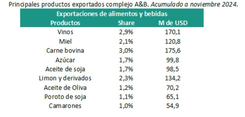 El sector alimenticio y de bebidas también desempeña un rol fundamental en el comercio bilateral. Entre los principales productos se encuentran el vino, la miel, los aceites, los porotos de soja, los cítricos (como el limón) y la carne bovina. Este sector representa el 17% del total exportado, con un valor de u$s 989,2 M.