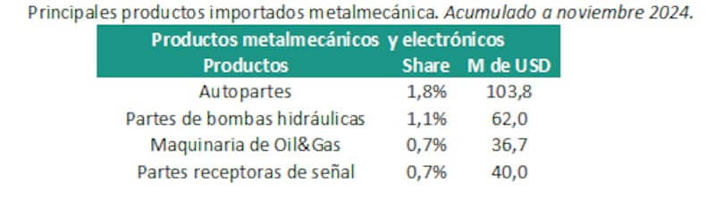 También destacan diversas partes de la industria metalmecánica, destinadas al sector automotriz-autopartes, a la electrónica de consumo (celulares) o insumos para antenas de señal, y maquinaria de Oil&Gas. Representan el 4,3% del total importado, con un valor de u$s 242,5 M. Las importaciones de maquinaria industrial y las autopartes importadas desde Estados Unidos son clave para la modernización de sectores como el automotriz y el petroquímico en Argentina.
