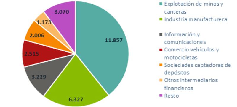 Dentro de los u$s 30.000 millones que entraron desde Estados Unidos, casi un tercio fue a parar a la extracción de petróleo crudo y gas natural (u$s 9.278 M), seguida ya en un nivel más bajo por la industria manufacturera (u$s 6.327 M), los servicios de telecomunicaciones (u$s 3.229 M) y el comercio automotriz (u$s 2.515 M).