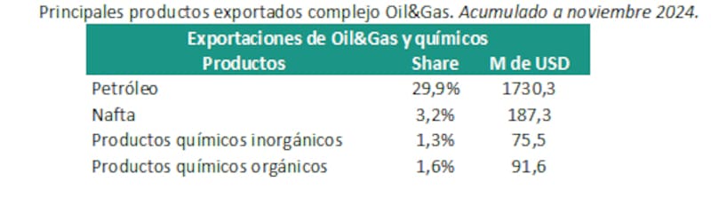 El principal complejo exportador hacia EE. UU. es el de Oil & Gas, junto con la industria química. Los productos destacados incluyen petróleo crudo, nafta y productos químicos orgánicos e inorgánicos, que en conjunto representan el 36% de las exportaciones totales, por un valor de u$s 2.084,7 M acumulado a noviembre 2024.