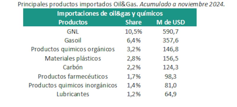 Principalmente Argentina importa insumos difundidos para la industria, como carbón y químicos, así como GNL y gasoil para la generación de energía y para suplir la demanda de consumo de vehículos pesados. Estos productos representan el 29,4% del total importado, por un valor de u$s 1.620,1 M en el acumulado a noviembre del 2024.