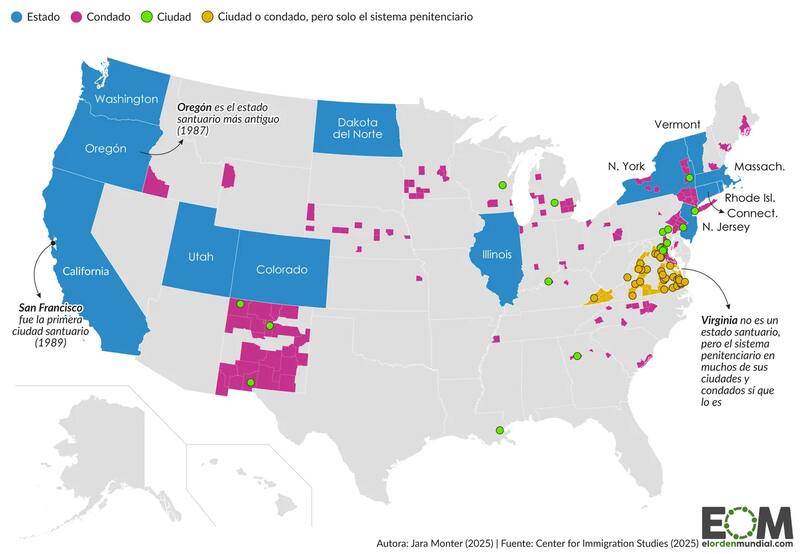 El Gobierno de Donald Trump ha puesto en la mira a varias ciudades de Estados Unidos por sus políticas de protección a los migrantes. Estas ciudades de Estados Unidos son conocidas por ser territorios santuario, lugares donde los inmigrantes, especialmente aquellos sin documentos, encuentran un refugio ante las amenazas de deportación.