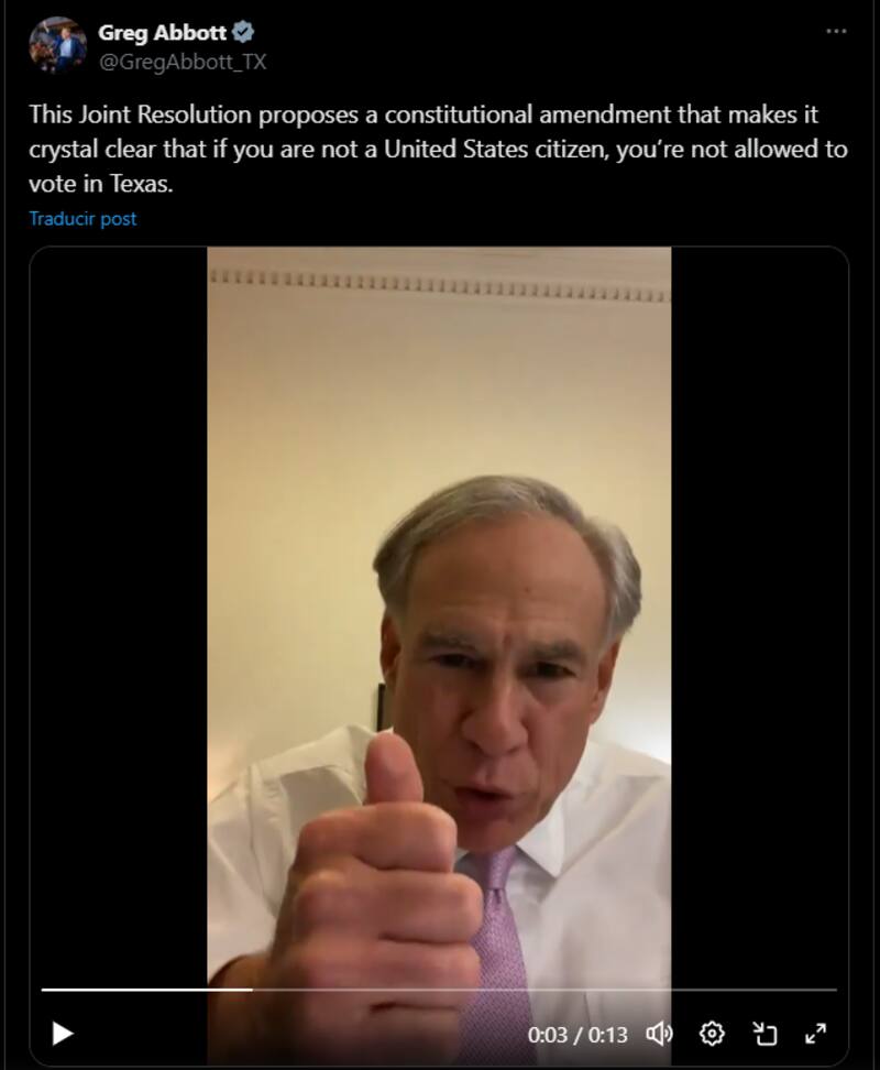 La resolución firmada por Greg Abbott pretende dejar sin posibilidad de voto a quienes no tengan ciudadanía estadounidense. Para lograrlo, se impulsa una enmienda constitucional en Texas que dejaría por escrito lo siguiente: si no eres ciudadano de Estados Unidos, no puedes votar.