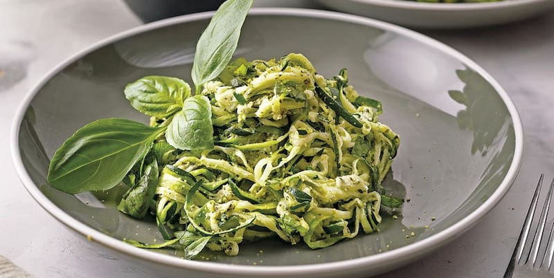 Espaguetis de calabacín al pesto: utiliza un rallador de verduras o un spiralizer para cortar los calabacines en forma de espaguetis. Luego, mezcla los espaguetis de calabacín con pesto casero o comprado en tienda y sirve como guarnición o plato principal.
